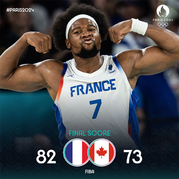 24直播网讯 8月7日讯 奥运男篮1/4决赛,法国对阵加拿大,本场比赛法国主动变阵将戈贝尔和富尼耶撤下主力。开场后法国状态不错,尤其是提上首发的科尔迪尼耶首节独得10分,反观加拿大先发手感低迷打了8分钟只得5分。第二节加拿大状态稍有回暖,法国坚决进攻内线制造杀伤,亚历山大手感回暖连连砍分一度帮助加拿大将分差追到个位数,但法国依靠亚布塞莱和莱索尔坚决冲击内线又将比分拉开。下半场回来亚历山大状态依旧火热,他再次帮助加拿大追到只差8分,法国依靠积极的拼抢稳住阵脚,末节两队亚历山大和巴雷特两人联手多次发起反扑,关键时刻富尼耶连续砍分并且命中一记超远三分帮助法国始终保持优势,加拿大无力回天,最终法国82-73击败加拿大晋级四强。