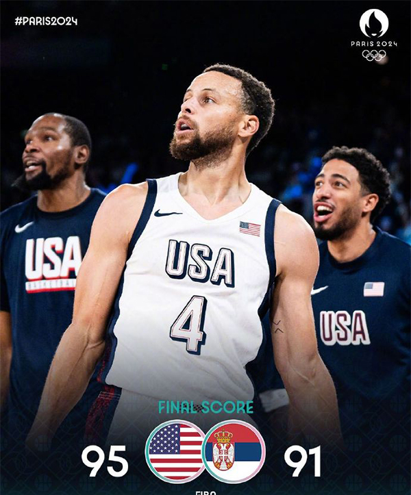 24直播网8月9日讯 奥运男篮半决赛,美国对阵塞尔维亚。比赛开始,库里火力全开3分钟砍下14分,但塞尔维亚多点开花强势回应,次节塞尔维亚连中三分将分差拉开到17分,美国男篮内外开花苦苦追赶,詹姆斯助攻库里飙中三分后自己打成2+1,但半场战罢美国队还是以43-54落后11分。易边再战,双方围绕两位数的分差展开激烈争夺,库里和霍勒迪连中三分,末节塞尔维亚命中率骤降,美国男篮利用防守反击不断蚕食分差,恩比德连得5分率队打出7-0扳平比分,双方争夺陷入白热化,关键时刻詹库合力连得7分完成反超,塞尔维亚后劲不足,最终,美国男篮完成17分的逆转,95-91挺进决赛。