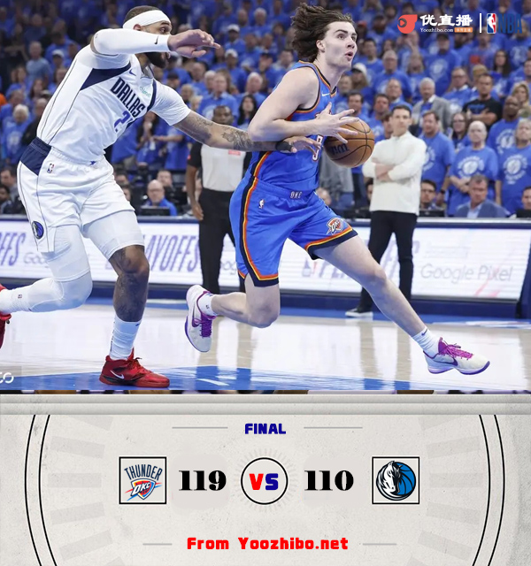 24直播网讯 5月10日讯 西部半决赛今日继续开打,雷霆坐镇主场迎来和独行侠的G2之战,首战雷霆主场22分大胜独行侠先拔头筹。上一场手感不佳且三分8投1中的东契奇早早进入状态,首节他命中4记三分独得16+6,同时也有3记三分入账拿到11分的华盛顿成为奇兵协助球队取得微弱优势;雷霆方面以亚历山大和替补端的杰林为主一路紧追比分;次节东契奇遭到重点盯防更多以梳理进攻为主,反倒是华盛顿持续开火为球队守住微弱优势。雷霆这边进攻端稳定奈何就是无法限制对手,尤其整个上半场独行侠角色球员贡献颇多为球队拿到6分领先进入下半场。休息归来雷霆上来连续远投得手送上13-4的攻势一举反超比分,然而独行侠被动之下不是东契奇或欧文站出来,反倒是小哈达威末段连拿10分直接扭转局势并一度帮助球队取得14分领先;末节雷霆再送6-0追至4分,但回头东契奇在崴脚的情况下命中三分迅速稳住局面,整个第四节独行侠虽然无法彻底打垮对手但关键时刻连续拿分牢守领先。最终,独行侠客场力克雷霆拿下比赛,总比分1-1战成平手。