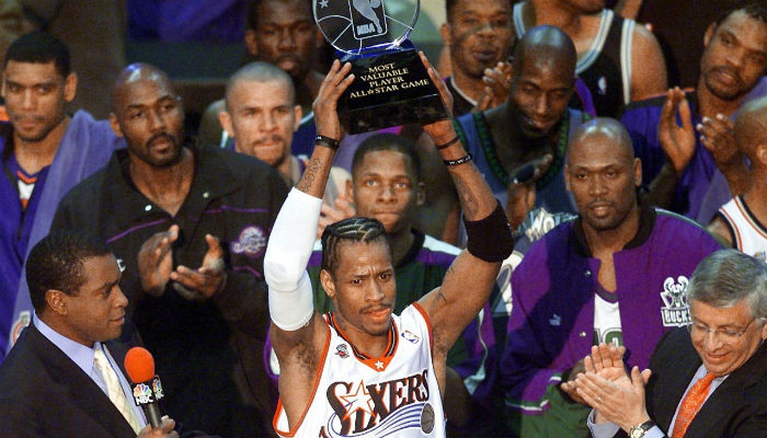 西部阵容 比赛回顾:前39分钟,西部全明星利用身高优势完全控制了比赛,在比赛还有9分钟结束的时候,东部全明星还以74比95落后,但就在这9分钟里,阿伦-艾弗森突然爆发,得到全部25分中的15分。史蒂芬-马布里(Stephon Marbury)同样在最后53秒投中2记三分(包括一记28秒时的三分球)帮助东部全明星完成逆转 。科比-布莱恩特(Kobe Bryant)为西部全明星得到19分,但是他们浪费了21分的领先优势输掉了比赛。当时的NBA常规赛得分王布莱恩特本来有机会完成最后一投,但他把球 传给了蒂姆-邓肯(Tim Duncan) 后者投丢了绝杀。数据统计: