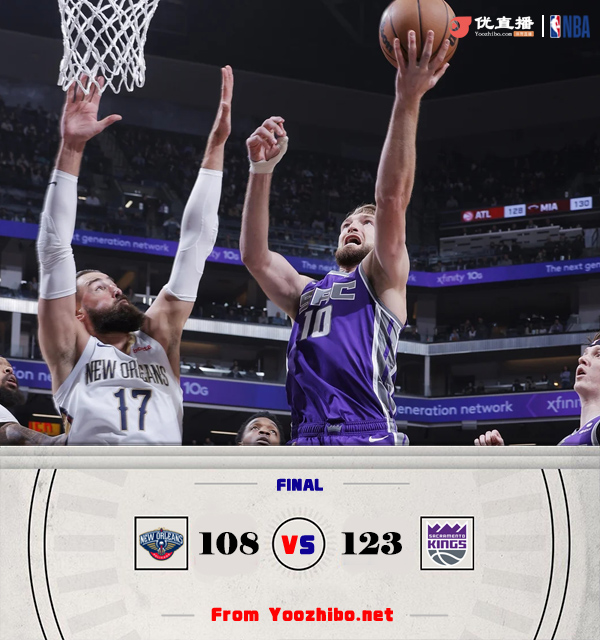 24直播网3月7日讯 NBA常规赛继续进行,国王主场迎战鹈鹕,国王目前37胜26负继续高居西部第3,而鹈鹕则是31胜33负排在西部第9位,福克斯因腿筋酸痛缺战本场比赛。双方上来就展开对攻战,英格拉姆状态不错,得分的同时还能串联起球队,两队命中率都很高,国王也是全民皆兵能咬住比分,随后许尔特找到手感接连外线发炮帮助国王一波8-0反超比分,但鹈鹕也依靠出色的三分手感再次追平比分。下半场,小萨博尼斯终于发力,进攻端得分助攻样样有,国王顺势领先到双位数,第三节末莱尔斯带领国王替补将分差继续拉大至18分,末节国王越打越好领先至20分以上,鹈鹕无力回天,最终国王123-108击退鹈鹕。