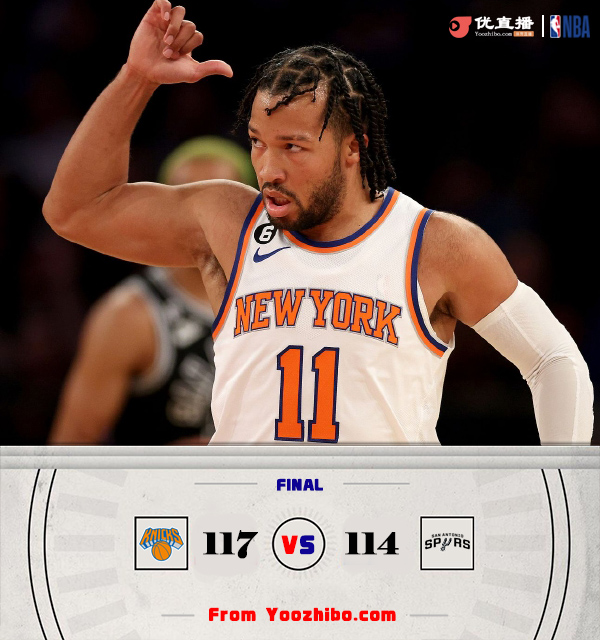 24直播网1月5日讯 NBA常规赛尼克斯对阵马刺,尼克斯目前排在东部第八,最近状态不错取得2连胜,巴雷特继续缺阵,马刺继续排在西部倒数第二,最近遭遇2连败。开场后布伦森连续单打见效帮助尼克斯早早取得两位数优势,马刺在节中一度掀起反扑缩小分差,但尼克斯后程发力再次将分差拉大。第二节回来马刺突然爆发打出一波13-0完成反超,尼克斯将近6分钟未能得分,兰德尔连续强攻为尼克斯稳住阵脚,上半场尼克斯领先7分。下半场两队大打对攻战,尼克斯外线频频命中三分,约翰逊则连续打成2+1为马刺咬住比分。末节马刺依旧紧追不舍并且一度反超比分,关键时刻布伦森连续单打得手帮助尼克斯夺回领先,马刺最后关头在落后2分的情况下出现一次发球违例,最终尼克斯力克马刺取得3连胜,马刺遭遇3连败。