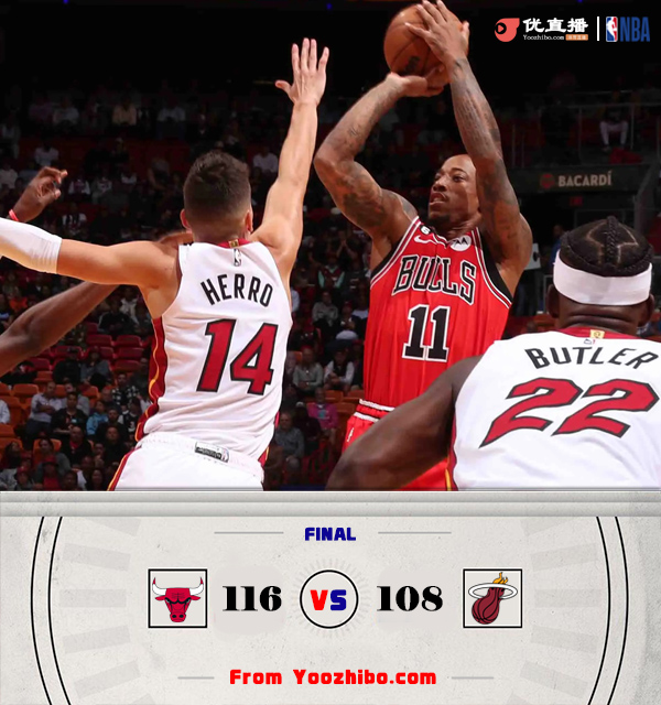 24直播网10月20日讯 热火今日坐镇主场迎战自己新赛季的首个对手公牛,热火方面除了受困肌腱炎的奥拉迪波外核心阵容基本全员可以出战;公牛这边则连续遭到打击,除了鲍尔以外,拉文因为膝盖问题也缺席了本场比赛。热火在面对阵容不整的公牛只打了一节好球,公牛虽然缺少了拉文和鲍尔等核心主力,但以德拉季奇和道苏姆为首的他们在第二节轰进7记三分改写开局不利局面。下半场成为德罗赞的表演时间,第三节他疯狂砍下19分,第四节也有9分入账帮助公牛守住胜利。最终,公牛客场扑灭热火迎来开门红。