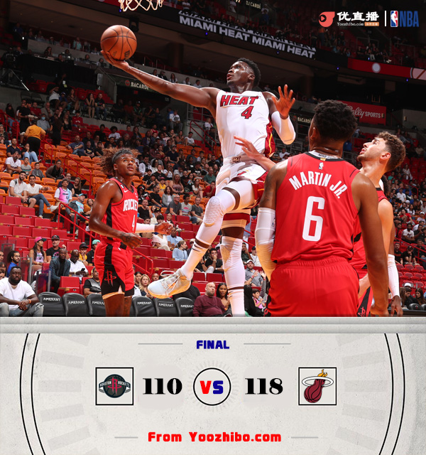 24直播网10月11日讯 火箭和热火今日迎来一场季前赛对决,火箭一众新人在季前赛表现相当不错且两战全胜,热火目前季前赛三战两胜。上半场的争夺双方效率奇高,首节火箭以格林砍下11分为首,加之火箭节中送出12-0的攻势一度拿到两位数领先;但热火在第二节轰出更加高效的进攻,他们这一节开局送出14-4迅速追上比分,单节狂轰38分的同时反超1分进入下半场。下半场的对决热火在拉锯战中笑到最后,尤其是第四节初一波12-3的进攻高潮直接将优势扩大至16分奠定胜局。最终,热火击败火箭迎来季前赛三连胜,而火箭则遭遇季前赛首败。