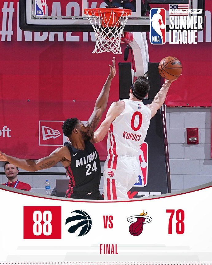 24直播网讯7月16日讯 NBA拉斯维加斯夏季联赛继续进行,热火对阵猛龙,热火的约维奇和罗宾逊,猛龙的科洛克都值得人们关注一下。开局双方虽然命中率不高,但比分一直很胶着,热火抓住机会建立领先,但猛龙马上回应小高潮反超了2分,次节热火陷入得分荒,布鲁克斯外线手感火热接连扔进三分帮助猛龙直接拉开双位数分差。第三节,热火进攻端还是找不到状态,单节只得到14分,猛龙越打越好将分差拉开至20分以上,末节风云突变,热火终于找回手感,接连打出小高潮一度追到差5分,但猛龙及时止血稳住优势,最终猛龙力克热火。