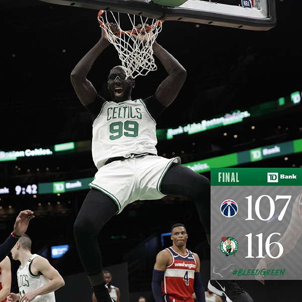 24直播网1月9日讯 凯尔特人坐镇主场迎战奇才,首节两队核心展开对攻,布朗和塔图姆为绿军连中三分,但是奇才的比尔和威少里突外投频频得分还以颜色,双方紧咬比分。不过,奇才在次节命中率下滑,布朗和塔图姆则延续手感率领绿军打出高潮,以66-47领先19分结束上半场。易边再战,奇才找回手感,比尔再度开火频频砍分,贝尔坦斯在末节连中三分,奇才一度把分差缩小到4分。但是布朗和塔图姆在比赛末关键时刻及时站出来得分回应,最终帮助绿军以116-107力克奇才,取得4连胜。