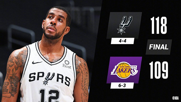 24直播网1月8日讯 湖人坐镇主场迎来马刺的挑战,马刺上一场击沉快船结束4连败,湖人则延续状态目前豪取4连胜。上半场的马刺反客为主早早进入状态,凭借着双德首节合力攻下24分,马刺抢得先机取得8分领先,次节湖人仍然阻止不了马刺的进攻,马刺半场高效率命中10记三分,球队凭借出色的内外结合保持9分领先进入下半场。第三节湖人末段发力并送出15-5的攻势抹平比分看到希望,然而他们第四节初又一次哑火,盖伊连砍8分成为关键先生,马刺送出一波11-4的攻势重新取得两位数的领先奠定胜局,最终,马刺客场击败湖人并终结对手4连胜。