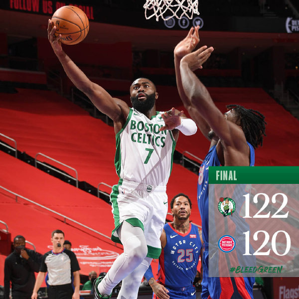 24直播网1月4日讯 NBA常规赛,活塞今日主场迎战凯尔特人,两队前天刚刚交手一次,活塞最终险胜拿到了本赛季的第一场胜利,本场凯尔特人势必寻求复仇。比赛上来两队便陷入拉锯战,场上比分交替领先,次节中后段凭借着布朗的出色发挥,凯尔特人在半场结束时取得4分的领先。易边再战,双方依旧保持胶着,都没有获得拉开分差的机会,比赛悬念保持到了最后,关键时刻塔图姆罚球线命中准绝杀,随后又封盖下格里芬的绝杀三分,最终凯尔特人险胜活塞,实现复仇。