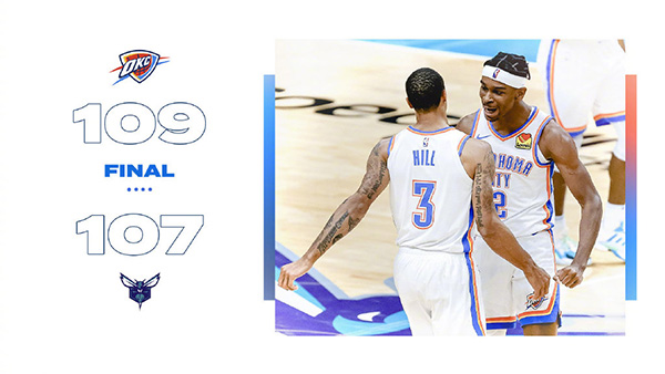 24直播网12月27日讯 NBA常规赛雷霆客场挑战黄蜂,这是雷霆新赛季第一场正式比赛。开场后两队就打得个势均力敌,鲍尔一扫上场比赛颓势在首节就表现不错,第二节格拉汉姆突然爆发帮助黄蜂一度领先到11分,但是希尔和亚历山大帮助雷霆追上比分,半场打完,黄蜂59-57领先雷霆。下半场回来黄蜂进攻乏力,虽然雷霆进攻也比较一般但仍旧完成反超,最后一节雷霆依靠三分线外的不错手感将领先巩固在两位数,但是最后时刻布里奇斯三个三分帮助黄蜂在9.7秒的时候追平比分,亚历山大晃开防守跳投命中,最终雷霆109-107击落黄蜂取得赛季开门红。