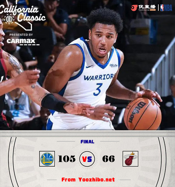 24直播网讯 7月7日讯 NBA夏季联赛加州经典赛,勇士对阵热火,勇士选秀大会主要选中52号秀波斯特,而热火则是选中15号秀韦尔和44号秀拉松。比赛开始,勇士上来就率先进入状态打出8-2不错开局,随后热火强势回应8-0反超分,伊森-汤普森手感不错帮助勇士首节领先7分,次节双方展开拉锯战,勇士外线保持火力,斯威德接连3记三分帮助热火咬住比分,但伊森-汤普森继续火热状态半场拿到15分,比克曼追身压哨三分再进助勇士半场领先16分。下半场,普劳登上来连续3记三分,个人打出11-0直接领先27分,又是斯威德站出来止血,双方围绕着30分左右的分差展开拉锯战,末节普劳登继续三分,但随后受伤离场,但热火抓不住机会,勇士直接拉开40分以上领先,最终勇士105-66大胜热火。