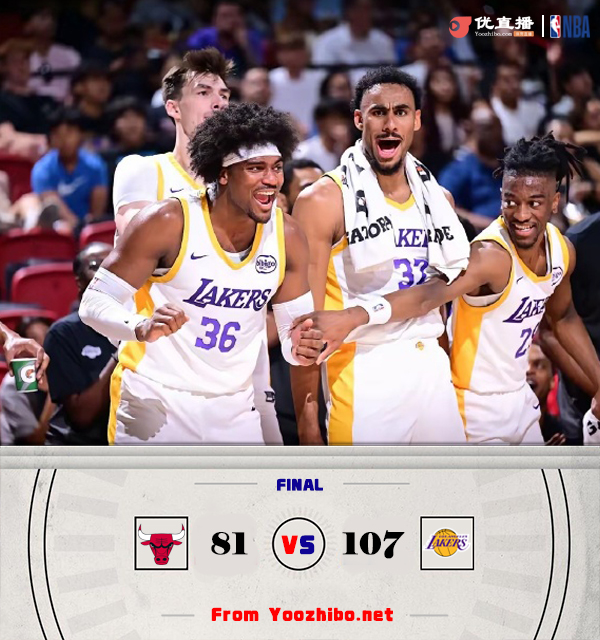 24直播网 7月21日讯 NBA夏季联赛,公牛今日对阵湖人,前者上场比赛战胜老鹰,后者则是取得两连胜。本场布朗尼和克内克特缺战。比赛上来,两队短暂拉锯后湖人突然发力,他们的进攻打得行云流水单节轰下39分,而公牛只拿到18分,次节湖人的命中率急剧下滑,得分也是未能上20分,不过公牛依旧低迷,半场结束时分差20分;下半场回来,湖人还是没能解决好进攻问题,公牛稍稍缩小分差,末节湖人重整旗鼓,一波10-0的小高潮直接将比赛悬念打没,最终湖人大胜公牛迎来三连胜。