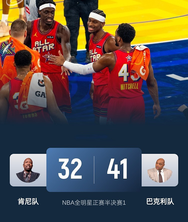 24直播网讯北京时间2月17日讯 NBA全明星正赛首场半决赛,肯尼队对阵巴克利队。肯尼队有爱德华兹、布伦森、贾伦-杰克逊、杰伦威、加兰、莫布里、康宁汉姆、希罗;巴克利队有约基奇、特雷-杨、亚历山大、文班亚马、西亚卡姆、申京、唐斯、米切尔。比赛开始,莫布里连续暴扣,巴克利队内外开花给出回应,唐斯和希罗对飙三分,肯尼队连中三分轰出11-2的攻击波占据主动,文班亚马暴扣引领巴克利队11-4的小高潮强势回应,亚历山大内外开花连得5分率队晋级决赛。最终,巴克利队41-32击败肯尼队。