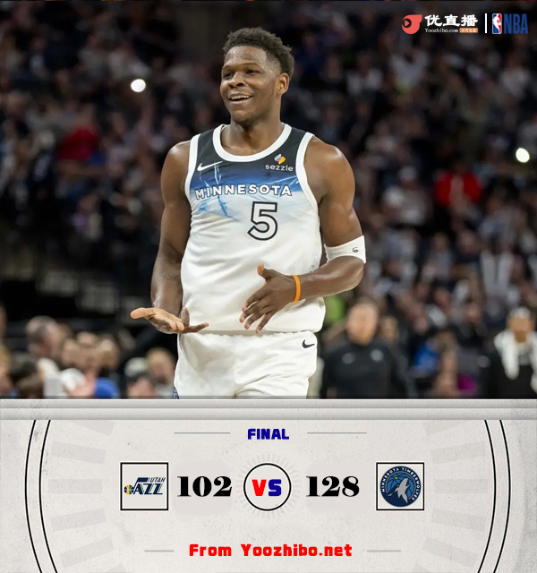 24直播网讯北京时间3月17日讯 NBA常规赛,森林狼主场迎战爵士。森林狼目前7连胜,39胜29负排在西部第7位;爵士则是8连败后15胜52负西部垫底。本场比赛,康利不打。比赛开始,爱德华兹状态出色,里突外投连砍10分带队轰出17-5不错开局,马尔卡宁接连三分止血,爱德华兹进攻挡不住单节轰下21分带队首节领先14分,次节爵士上来12-2直接咬住比分,森林狼迅速调整,多点开花回应12-2稳住领先优势,半场森林狼还领先11分。第三节,塞克斯顿带队追分,但爱德华兹再次发力,单节又轰下16分,森林狼直接拉开20分以上领先,末节森林狼换上替补练兵,克拉克攻防带队拉开30分以上领先,爵士无力回天,最终森林狼128-102大胜爵士,豪取8连胜同时送对手9连败。