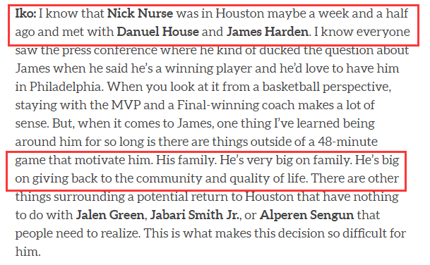 据火箭记者Kelly Iko报道,76人新任主帅纳斯上周出现在休斯敦,而且已经和哈登以及豪斯完成了会面,纳斯了解到家庭因素将会影响哈登今夏在自由市场上的决定。