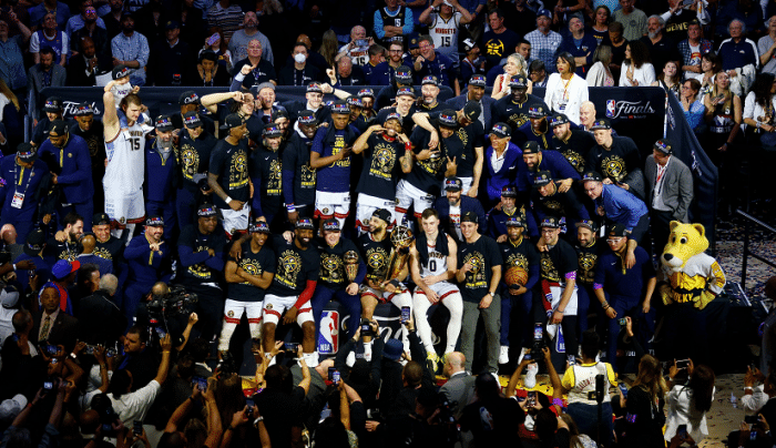 来源:24直播网06-13 15:3224直播网06月13日NBA总决赛落下帷幕,掘金在G5主场逆转击败热火,大比分4-1拿下队史首座NBA总冠军奖杯。掘金建队47年后夺队史首冠,成目前用时最长的总冠军球队,非常不容易,约基奇首度率队打进总决赛就夺冠,表现强势,他个人以全票的成绩斩获FMVP,实至名归。马龙在颁奖仪式期间表示不满足这一个总冠军,豪气冲天。掘金夺冠,更衣室成为欢乐的海洋。