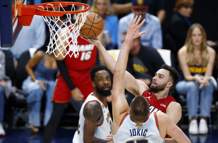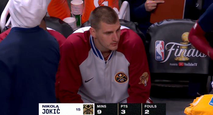 总决赛G5第一节,约基奇因早早吃到2次犯规而无奈下场,首节上场9分钟仅仅拿到3分;约基奇坐回替补席,马龙安排小乔丹上场,结果小乔丹被阿德巴约打爆,后者单节独砍14分6篮板。