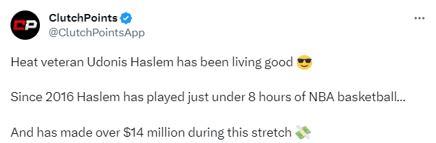 来源:24直播网06-12 15:4024直播网06月12日美媒晒出热火43岁老将哈斯勒姆近年来的收入情况,7年出战不到8小时狂赚1400万美元,美媒Clutch Points配文写道:热火老将哈斯勒姆一直活得很滋润,自2016年以来,哈斯勒姆的NBA出场时间不足8小时,期间他挣得了超过1400万美元的薪水。