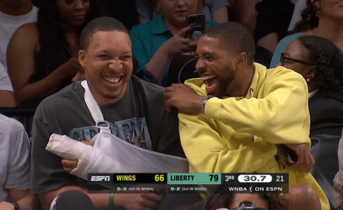 来源:24直播网06-12 10:4824直播网06月12日,绿军悍将格兰特-威廉姆斯术后亮相,并且和篮网新核布里奇斯一起观看WNBA,两人坐在一起都开怀大笑;其中格威在街头接受采访时,居然嘲讽热火马上就要被掘金淘汰了。