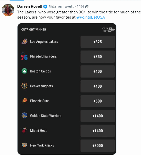 据名记Darren Rovell报道,NBA最新夺冠赔率出炉——湖人+325、76人+350、凯尔特人和掘金+400、太阳+600、勇士和热火+1400、尼克斯+8000。