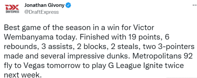 来源:24直播网10-01 11:3024直播网10月01日讯 ,在最新结束的一场法甲比赛中,文班亚马出战32分钟,得到19分6篮板3助攻2盖帽2抢断,帮助球队92-82获胜。选秀专家Givony评价道:“这是文班亚马本赛季至今打得最好的一场比赛。他投进了两个三分球,还有一些令人印象深刻的扣篮。”文班亚马明日将随队飞往拉斯维加斯,下周他将和G联赛的点燃队交锋两次,PK另一位状元热门亨德森。