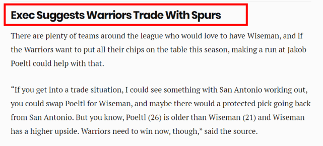 当初为了得到怀斯曼,勇士放弃了选中拉梅洛(三球)的机会,他们自然希望怀斯曼最终能打得出来。从报道来看,勇士还没下定决心,但至少已经在评估和考虑交易怀斯曼的可能。这位高管认为勇士可以和马刺进行交易,达到双赢的结果。