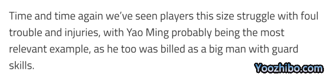 不过,美媒也谈到了这位球员令人担忧的一面,那就是伤病的隐患。“留在场上是文班亚马的一个问题,无论是犯规还是伤病,这都是球队要关心的,尤其是当我们看到雷霆的霍姆格伦(另一个超高超瘦的家伙)遭遇赛季报销后,”美媒写道,“我们一次又一次看到这样身高的球员与犯规、伤病作斗争,姚明可能是最相关的例子,因为他也曾被称为拥有后卫技术的大个子。”
