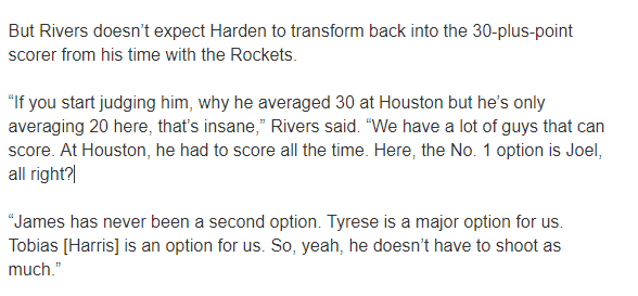 里弗斯还表示:我们有很多能得分的球员,在休斯敦(火箭)他必须一直得分,而在这里,我们的进攻第一选择是恩比德,哈登甚至都不是(得分)的第二选择,马克西是我们的主要进攻选择,哈里斯也是一个选秀,所以我们不需要他投那么多篮。