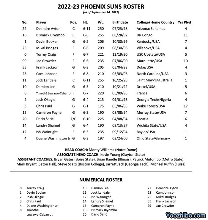 曝太阳至少售价25亿美元 公布18人训练营名单:保罗布克领衔冲冠