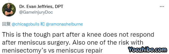 鲍尔已经养伤大半年仍未痊愈,而且需要再次接受手术治疗,对于鲍尔的伤病,医学专家Evan Jeffries表示:这是半月板手术后膝盖没有反应后最困难的部分,也是半月板切除术与半月板修复术的风险之一。