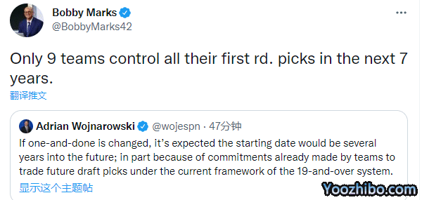 薪资专家Bobby Marks跟进报道,发推写道:未来7年,联盟仅有9支球队完全撑控着他们的首轮签。