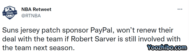 太阳的球衣广告赞助商PayPal也在今天发布声明,表示如果萨沃在一年禁赛期结束后继续参与太阳的事务,那么他们将不会和太阳续约。