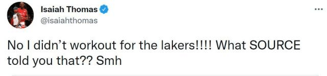来源:24直播网09-18 11:0024直播网09月18日据NBA名记Michael Scotto报道,湖人试训了多位自由球员,其中包括沙巴兹-穆罕默德、杰里米-兰姆、德维恩-培根、米耶-奥尼、小托马斯、阿莫尼-布鲁克斯、沙里夫-库珀和米查尔-穆尔德。毫无疑问,两届全明星小托马斯是名气最大的球员,穆尔德是勇士旧将,兰姆的实力也很出色。小托马斯第一时间辟谣,表示自己并未为湖人试训。他写道:“不,我没有为湖人试训!!!哪个消息源告诉你的?”