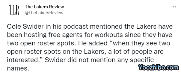 湖人落选秀斯威德还透露,由于湖人拥有两个空余阵容名额,他们一直在为自由球员举行试训,表示:当他们看到湖人有两个空余阵容名额,很多人都会感兴趣。
