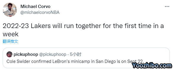 斯威德确认,队友勒布朗-詹姆斯组织的赛季前迷你训练营将于北京时间9月23日在圣迭戈举行,换言之,湖人2022-23赛季第一次合练将在一周内开始举办;另外湖人的新赛季媒体日在9月27日。