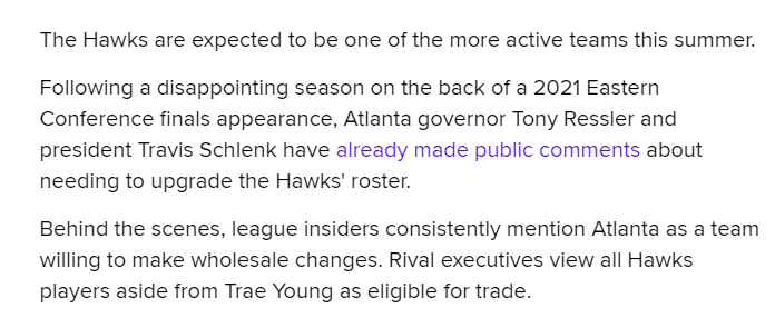 来源:24直播网05-25 11:0124直播网05月25日讯,据露天看台记者Jake Fischer报道,老鹰有望成为今夏在交易市场上最活跃的球队之一;联盟内部人士透露,老鹰是一支愿意进行大规模改变的球队。竞争对手的高管认为,除了特雷-杨之外,老鹰所有的球员都可以被交易。