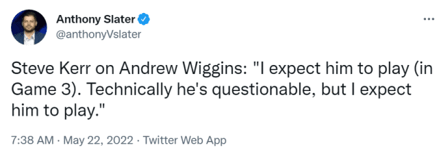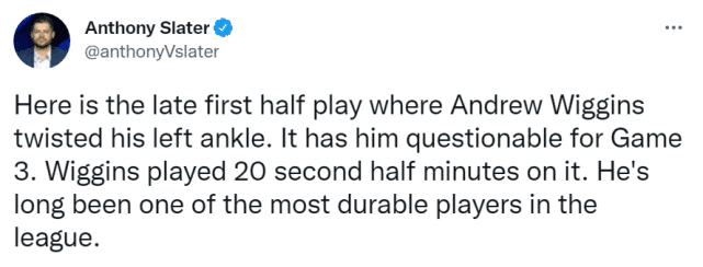 来源:24直播网05-22 15:2824直播网05月22日讯 ,西决G3的伤病报告上,维金斯左踝酸痛,被列为questionable(出战成疑,上场可能性50%)。勇士跟队记者Slater也晒出了维金斯受伤的一幕。他在G2上半场还剩2分24秒时扭到了左脚。