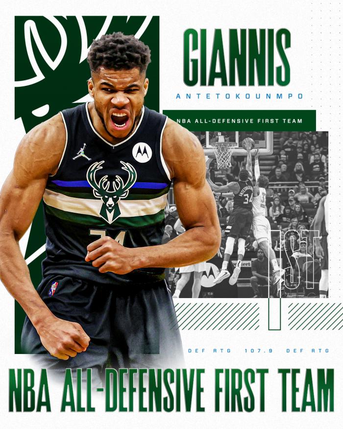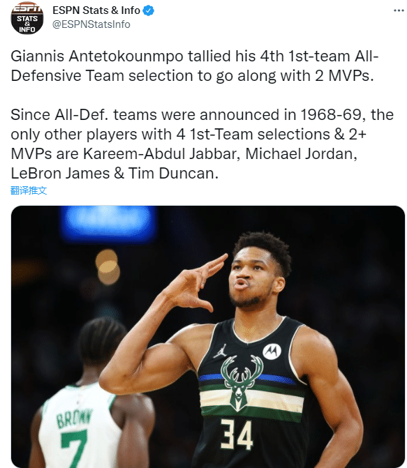 字母哥入选最佳防守一阵创纪录,比肩詹姆斯、贾巴尔、乔丹和邓肯,成为1968-69赛季之后第5位至少4次入选最佳防守一阵并且至少2次夺得MVP的球员。