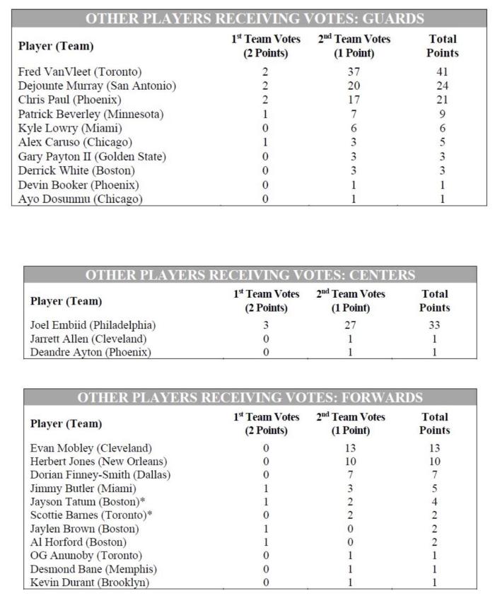 中锋球员:恩比德3张第一选票和27张第二选票,总共33分;骑士阿伦和艾顿都是1分;中锋位置总共5名球员获得选项,戈贝尔和罗威入选最佳防守阵容。
