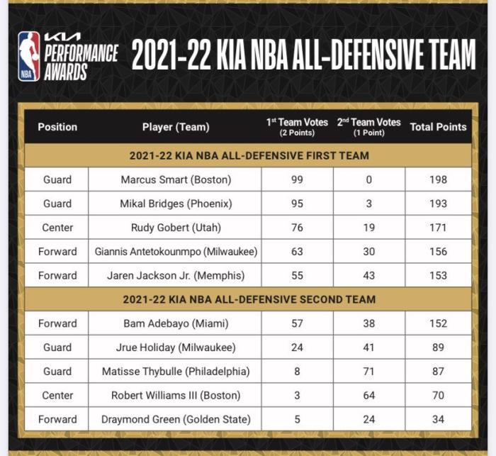 2022年NBA最佳防守阵容:斯马特字母哥一阵 追梦入选二阵贝弗利无缘