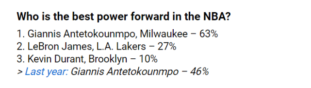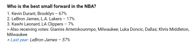 在最佳小前的票选中,杜兰特得到67%的票数,高居第一。在所有五个位置中,只有小前的领跑者和上赛季不同。上赛季是詹姆斯(得票率57%),新赛季,杜兰特遥遥领先。排名第二的是詹姆斯(17%),莱昂纳德(7%)位居第三。字母哥、东契奇、米德尔顿也得到票数。