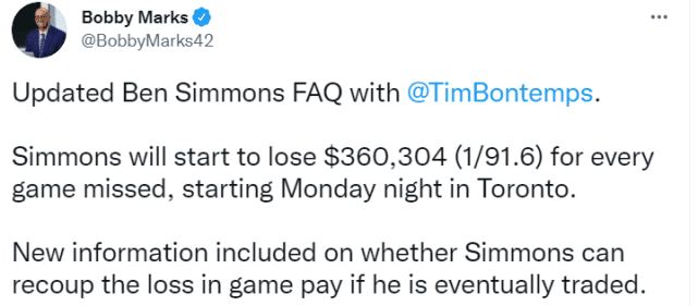 损失升级!西蒙斯每缺一场将扣除36万美元,交易离队也拿不回钱?