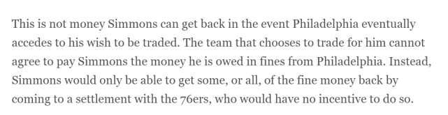 按照这个扣款新规定,如果西蒙斯缺席全部4场季前赛,他大概会损失144万美元。如果他被交易,假设交易时间是11月19日(进入常规赛后一个月),他损失的薪水总额大概是720万美元左右。
