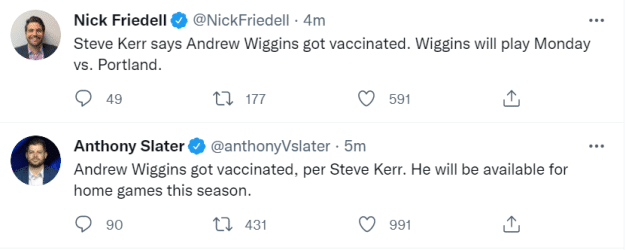 一天前,科尔表示维金斯因身体不适缺席了训练。随后。科尔重申了球队对于维金斯的态度,勇士预计维金斯可以出战本赛季的常规赛。此前维金斯曾表示由于信仰原因,不会接种新冠疫苗。
