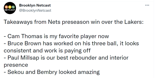 36岁的米尔萨普,是篮网阵中最老的球员。对湖人的季前赛,是他加盟篮网后的首场比赛。只打了18分钟,米尔萨普就证明了自己宝刀不老。10分10篮板的两双数据,还有3次助攻、1次抢断和2个盖帽,三分球4投2中。他不以护筐见长,但如果他的状态够稳定,有望凭借更全面的能力获得更多的出场时间。另一个老将阿德表现也不错,14分钟内得到6分4篮板3助攻1盖帽。