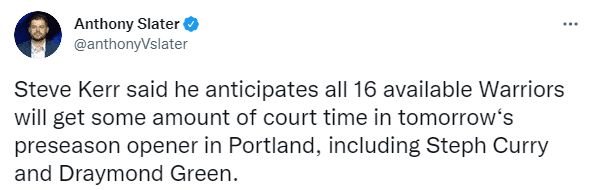 来源:24直播网10-04 10:5524直播网10月04日讯 ,NBA季前赛已经正式打响,勇士众将都能上场参加比赛,据勇士记者Anthony Slater报道,科尔表示,预计所有16名可用的勇士球员都将在明天对阵波特兰开拓者的季前赛揭幕战中获得一定的上场时间,包括斯蒂芬-库里和德雷蒙德-格林。