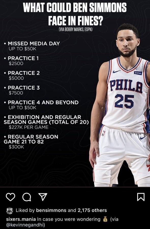 他不出现要罚多少钱?西蒙斯其实早已了然在胸。他之前甚至点赞了罚款明细图。除了上述缺席比赛的罚款,还写道:“缺席媒体日,最高罚款5万美元,缺席第一次训练罚2500美元,缺席第二次训练罚5000美元,缺席第三次训练罚7500美元,缺席第四次及以后的训练最高罚款5万美元。”