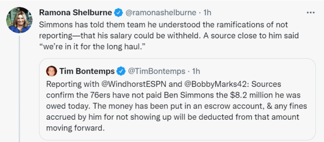 消息人士透露,在西蒙斯愿意前往76人报到时,他才会得到账户里剩下的钱。不过,西蒙斯已经告知他的团队,就算薪水被扣留,他也无意去报到。一个接近西蒙斯的消息源表示,他们已经做好“持久战”的准备。看来,西蒙斯决定要和76人硬刚到底了。西蒙斯在当地时间8月2日已经得到了他今年薪水的25%, 今天本该得到第二个25%。