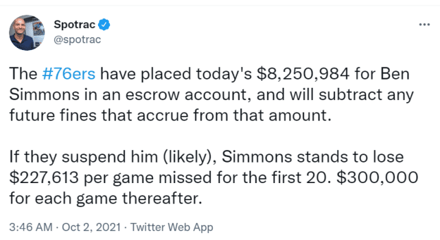 76人将在多伦多开始他们的第一场季前赛,如果西蒙斯没有参加那场比赛,他将损失大约22.7万美元。薪金专业网站Spotrac跟进报道称,西蒙斯缺席的前20场比赛,每场损失227613美元,20场之后缺席的比赛,每场损失增至30万美元。