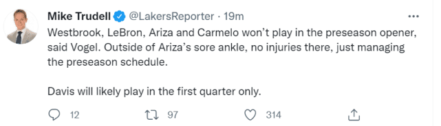 詹姆斯威少无缘首战篮网!湖人四将高挂免战牌,浓眉只打第一节