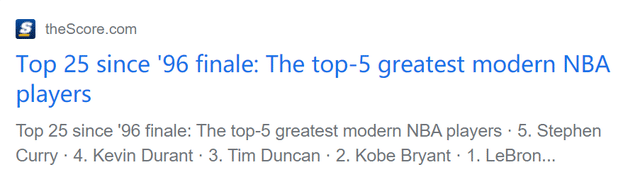 来源:24直播网10-02 10:2624直播网10月02日讯 过去25年,NBA出现过不少巨星级的人物。近日,美媒theScore评选了近25年的25大巨星,并在10月2日公布了最终前五的排名。詹姆斯高居榜首,科比排名第二,位居第三至五位的依次是邓肯、杜兰特和库里。(注:这是theScore基于NBA50大巨星的延伸,所以没有乔丹、奥尼尔等已经在那份榜单上的球星。)